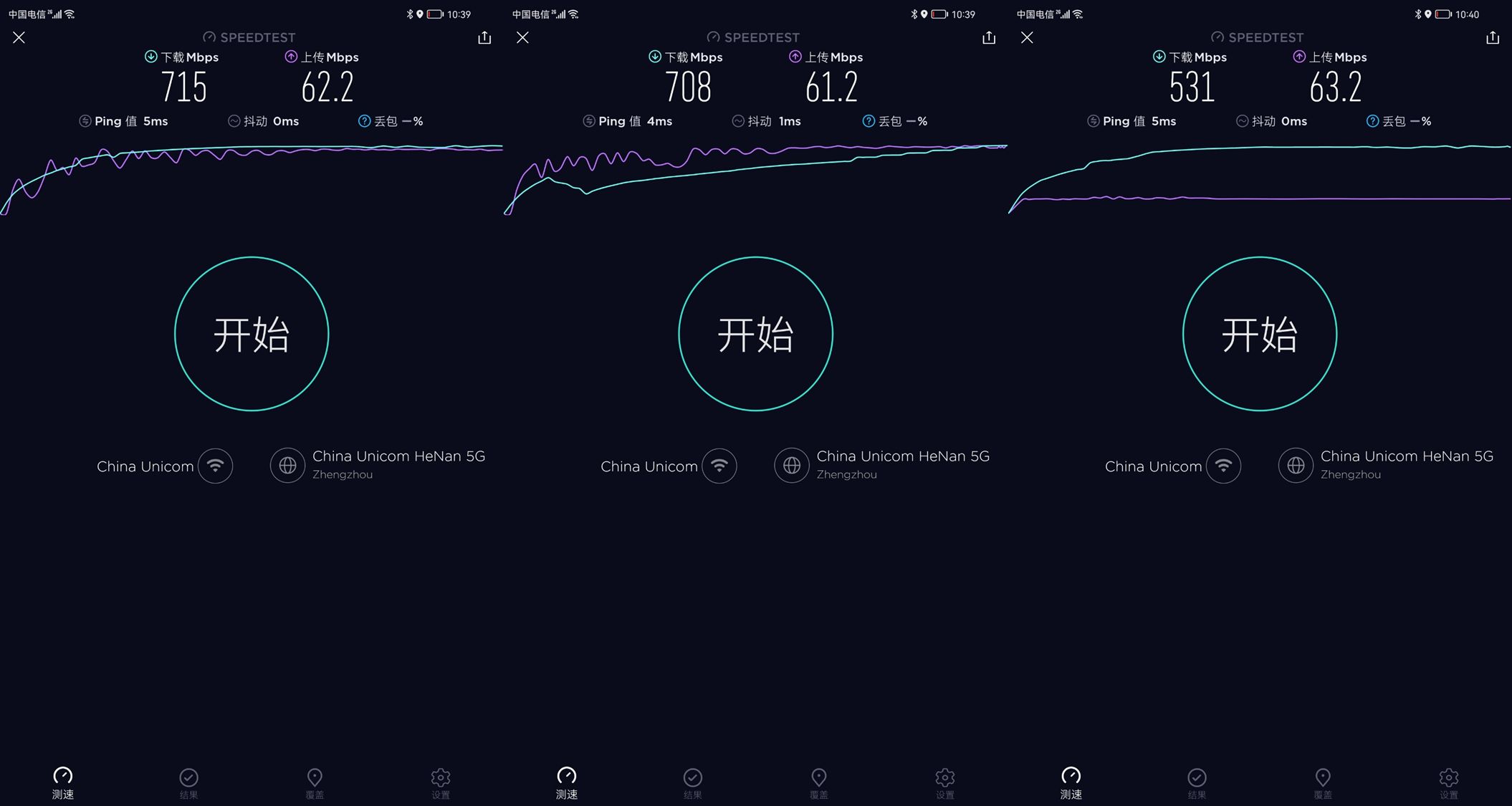 测试结果显示,三个地方的下载网速分别达到了715Mbps/708Mbps/531Mbps,上传网速分别达到了62.2Mbps/61.2Mbps/63.2Mbps;这个结果多少有些出乎意料。