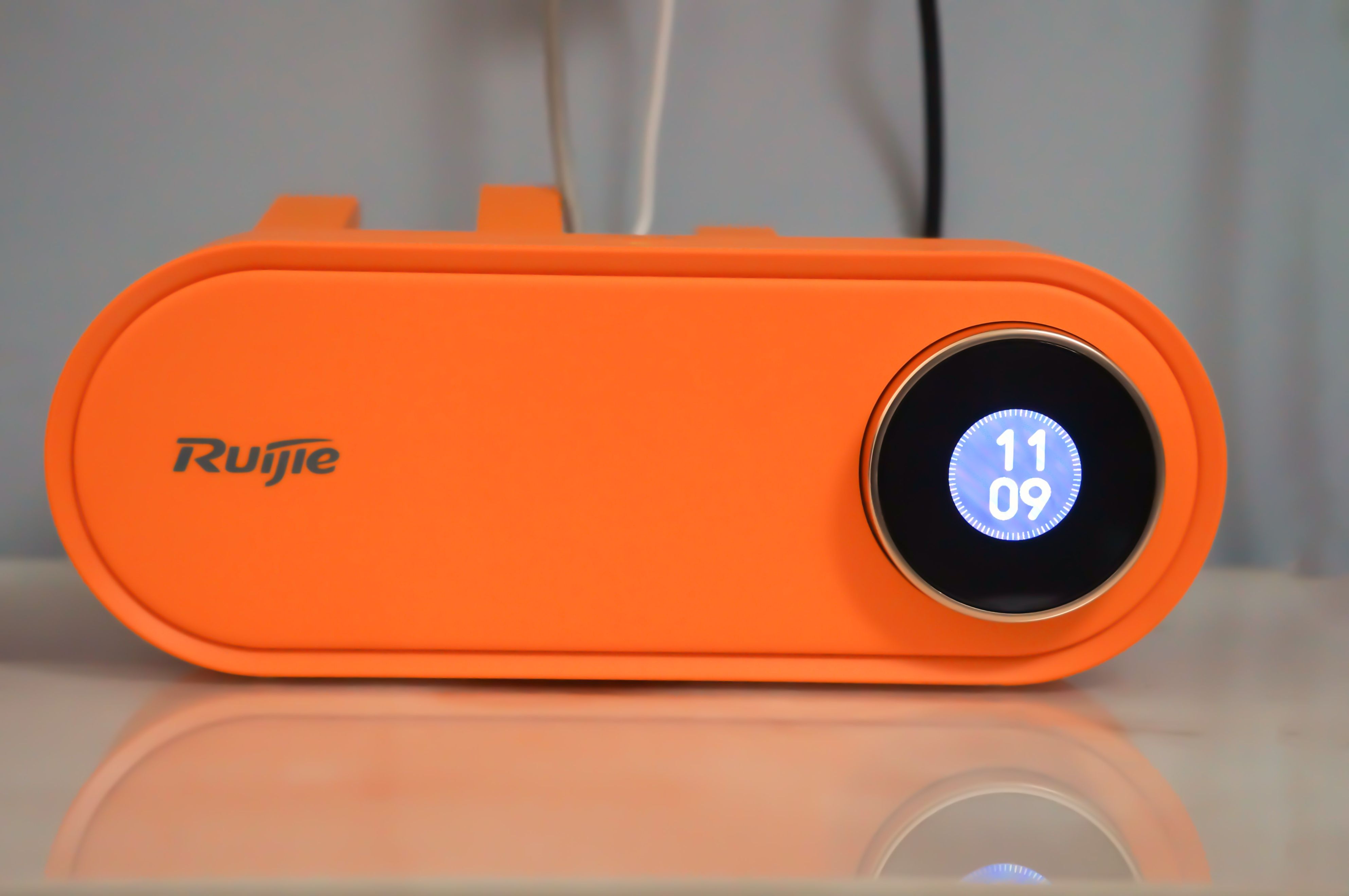 从外观设计上看,锐捷小白路由器就像是一个拥有多根天线的收音机。从正面看,锐捷小白路由器上方有四根天线,中间则是锐捷的品牌logo和智慧屏。通过智慧屏,我们和路由器可以实现更好的交互,包括查看路由器状态和关键信息(比如欠费、断网等故障反馈);这种可视化的设计很容易获得用户的好感。