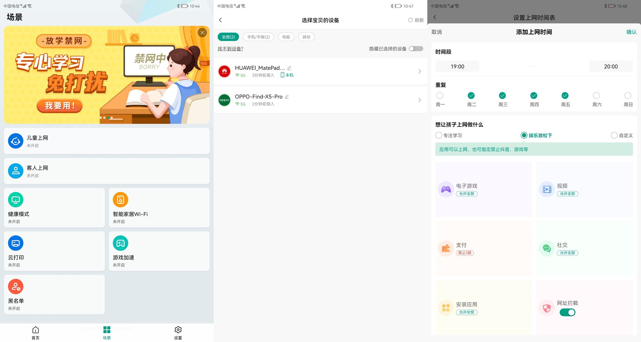此外,你还可以进行就孩子使用的平板、手机进行远程控制,比如上网课的时候别的应用都不能用;到时候一键断网有效管理孩子的上网时长等。白天外出上班通过APP远程管理家里孩子的用网行为真的很方便。