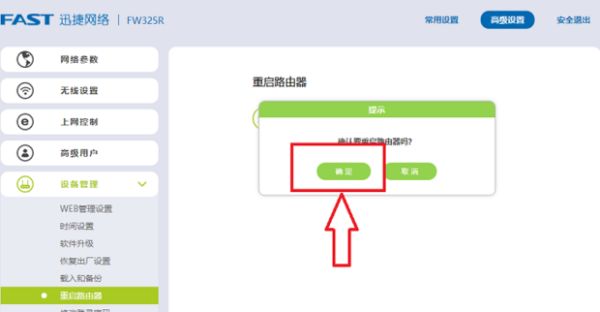 9.一般情况下密码更改后需要重启路由器才能生效。重启路由器分为断电重启和不断电重启,断电重启即拔掉路由器电源后重新插入即可,这里小编介绍不断电重启。还是这个操作界面,单击右上方的”高级设置“按钮。