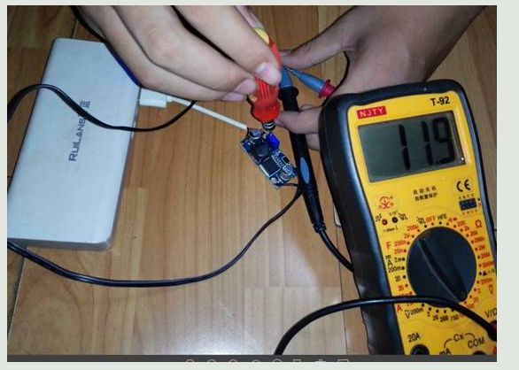 在连接完毕后,还要调整输出板的电压,由于光猫使用的是12V电压,我们只要将USB口接上充电宝,用万用表监测输出电压,将输出电压调整到12V就可以了。
