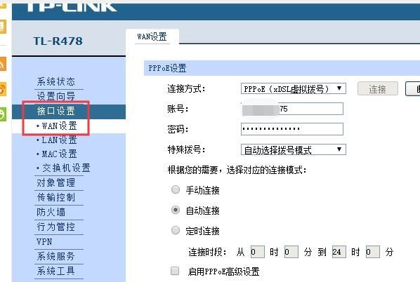 2、登录进入到该路由器的后台以后,点击接口设置,选择WAN设置。
