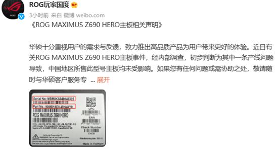 12月31日,华硕在微博平台发消息称将召回部分ROG Z690 Hero主板。华硕表示:“十分重视用户的需求与反馈,致力推出高品质产品为用户带来优质体验。近日有关ROG MAXIMUS Z690 HERO主板事件,经内部调查,初步判断为其中一条产线问题导致,中国地区所售此型号主板均未受影响。如果有任何问题或需协助之处,敬请随时与华硕客户服务专线联系”。
