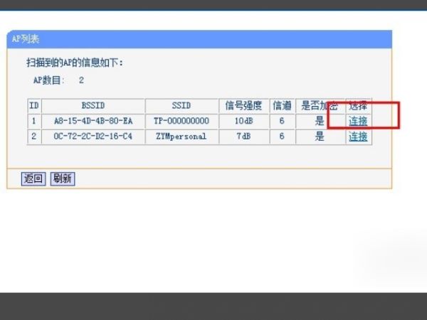 4、接下来,我们点击“扫描”,然后无线路由器自动会搜索到周围的无线路由器的信号,将搜索到的无线路由器展示在列表中,我们选择好准备进行桥接的无线路由器,然后点击“连接”。