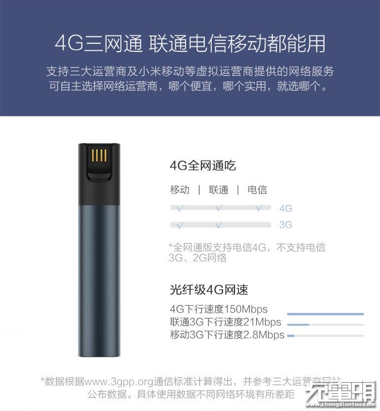 采用金属机身,自带磁吸式收纳数据线,隐藏式插卡位设计,美观便携。4G全网通吃,除电信2G、3G外,支持三大运营商及小米移动等虚拟运营商提供的网络服务。支持FDD-LTE、TD-LTE等多种模式,覆盖全球13个频段。电池容量10000mAh,拥有长达65小时的待机时间。双向支持QC2.0充放电,拥有最大18W输入,以及最大15W输出。最多可同时为8个无线设备及1个有设备提供网络服务,适合多设备共享。专属App可实现全方位管控:支持查看路由器信息,可管理流量、电量及网络等。