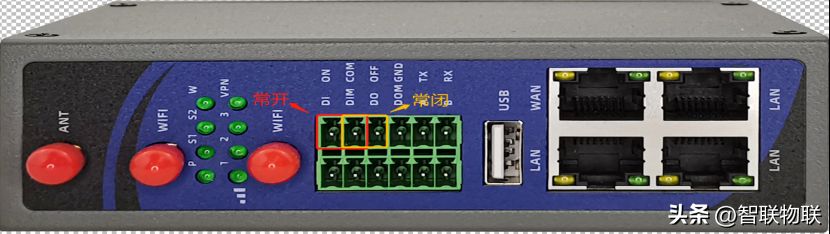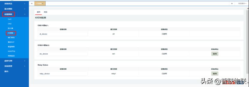 工业路由器IO控制是指路由系统已开发支持对用户DI(数字输入)/DO(数字输出)/Relay(继电器)类型的设备控制操作,目前各支持1路设备类型。 IO控制目前支持2种方式进行控制操作,即通过工业路由器web页面本地IO控制查看及通过工业路由器云平台进行远程控制查看。具体简单介绍如下,以智联物联工业网关IR4000示例。