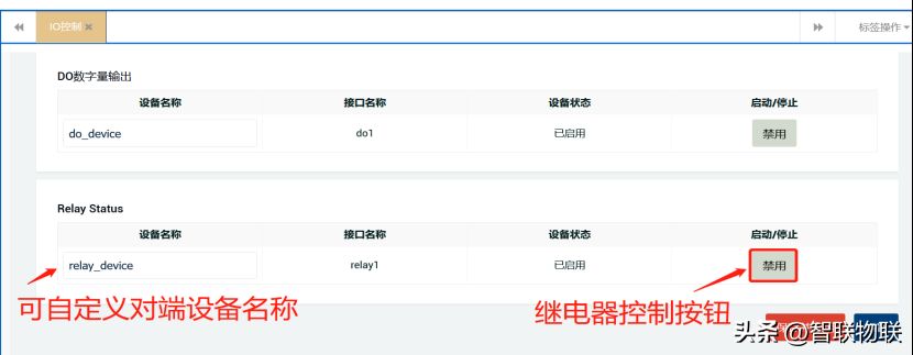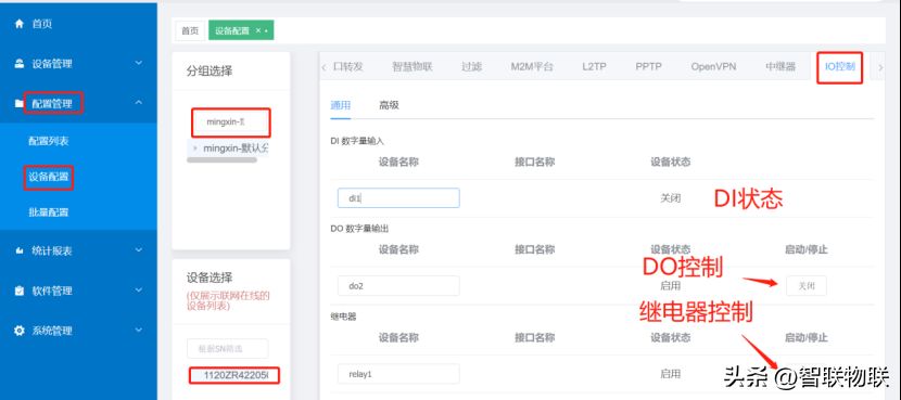 (2) 登录云平台后,打开配置管理-设备配置,选择对应的分组和设备,点击IO控制即可进行相关操作,具体功能如下图: