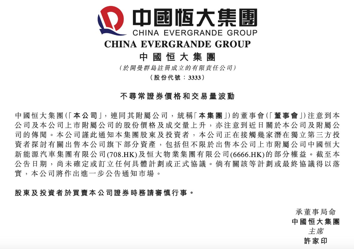 中国恒大:正在商讨出售新能源汽车和物业部门