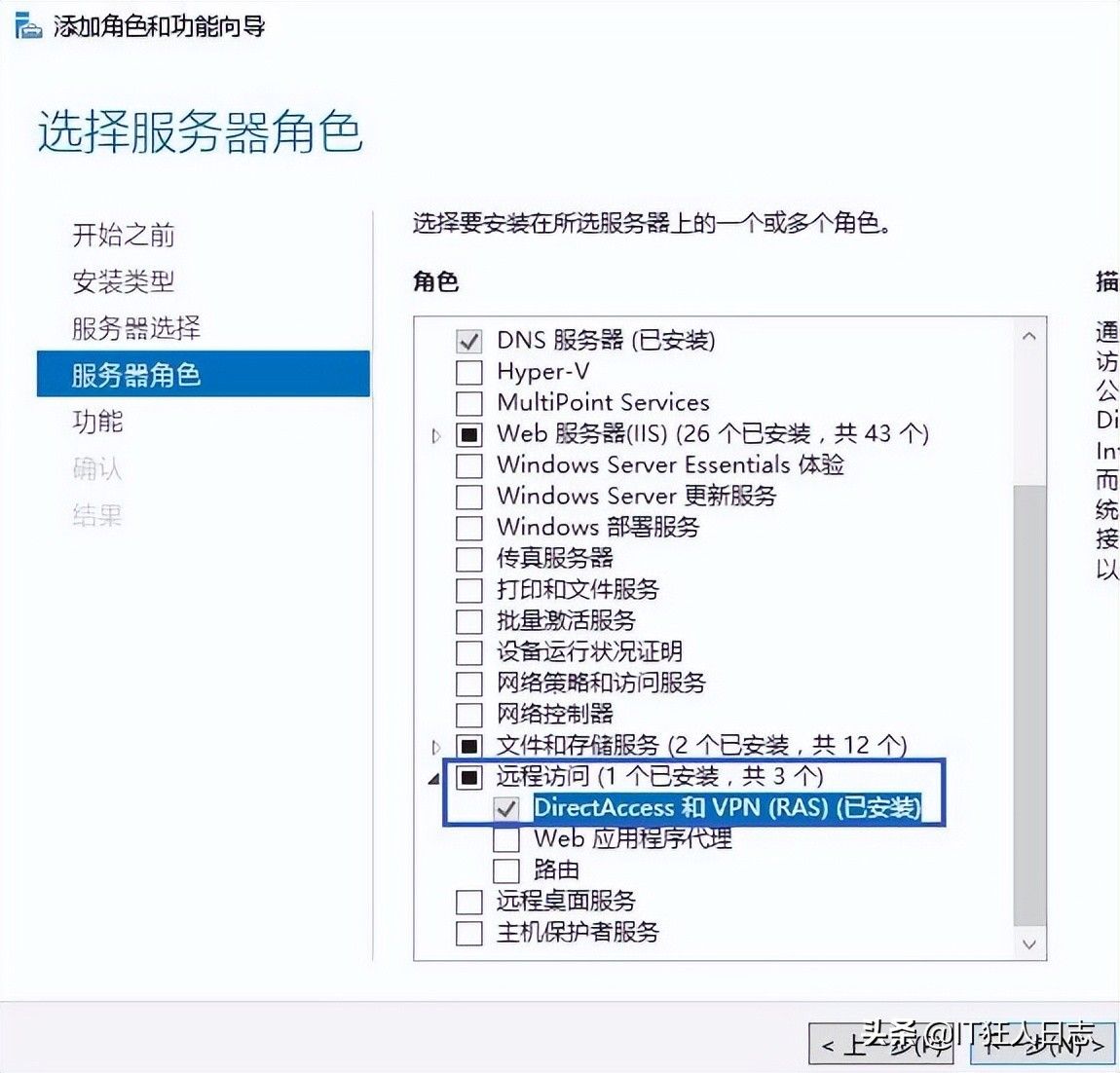 2、添加服务器角色,按照下图勾选添加远程访问服务;