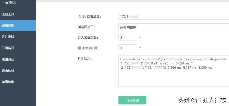 3、配置完成后,“路由追踪”检测一下,目的地址是填写云主机的内部IP地址(非公网IP),源接口当然是刚才建立的PPTP链路,两跳就到了,那就对了;