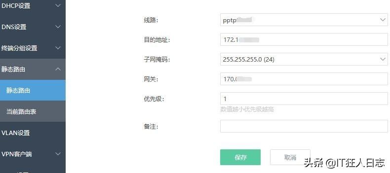 2、还得写一条静态路由,线路肯定是选择刚才建立的PPTP链路,目的地址是填写云主机的内部IP地址(非公网IP),网关是填写云主机上创建的地址池中留给自己用的那一个,本例中是:170.0.0.21;