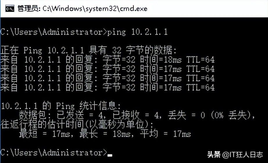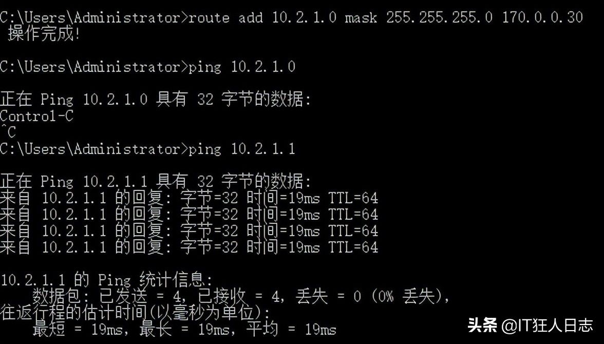 紧接着,再写一条到外地办事处的路由,然后ping那边的路由器IP,通了;