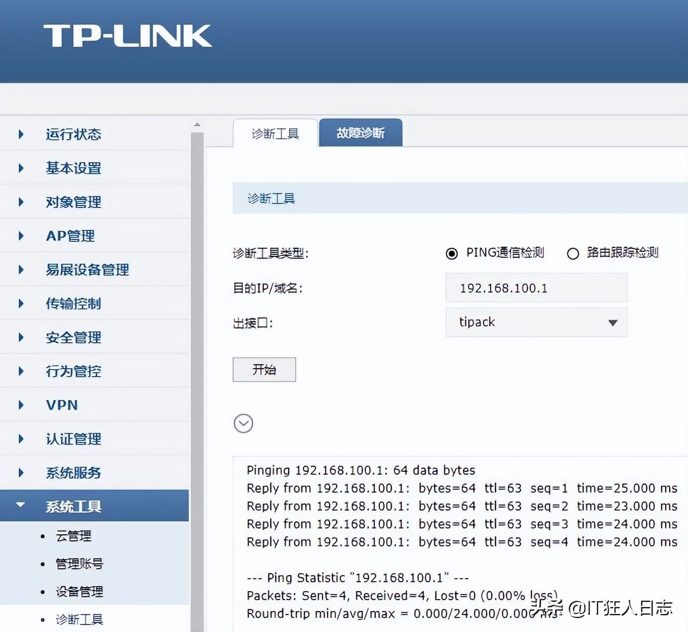 2、乘胜追击,登录爱快路由器,ping外地办事处的TP-LINK路由器,竟然不通!这……