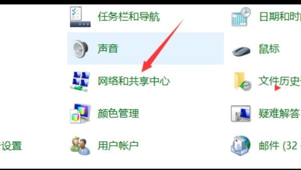 (2)选择网络和共享中心。