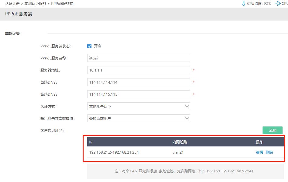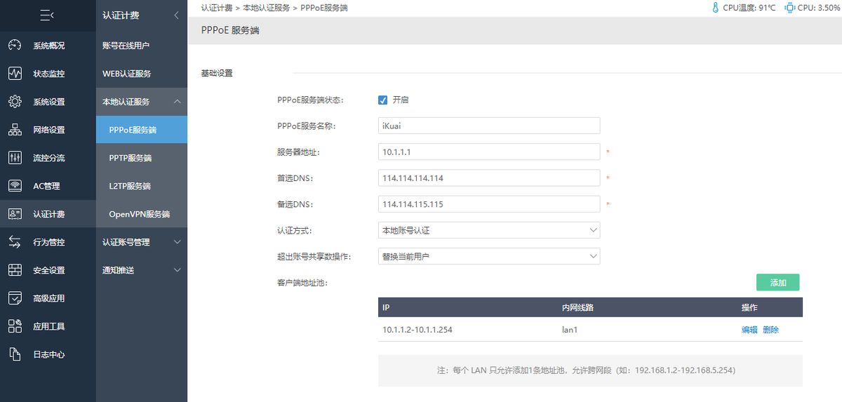 第三步:在认证计费--本地认证服务--PPPOE服务端,开启PPPOE服务端,在客户端地址池添加对应VLAN线路的VLAN地址。