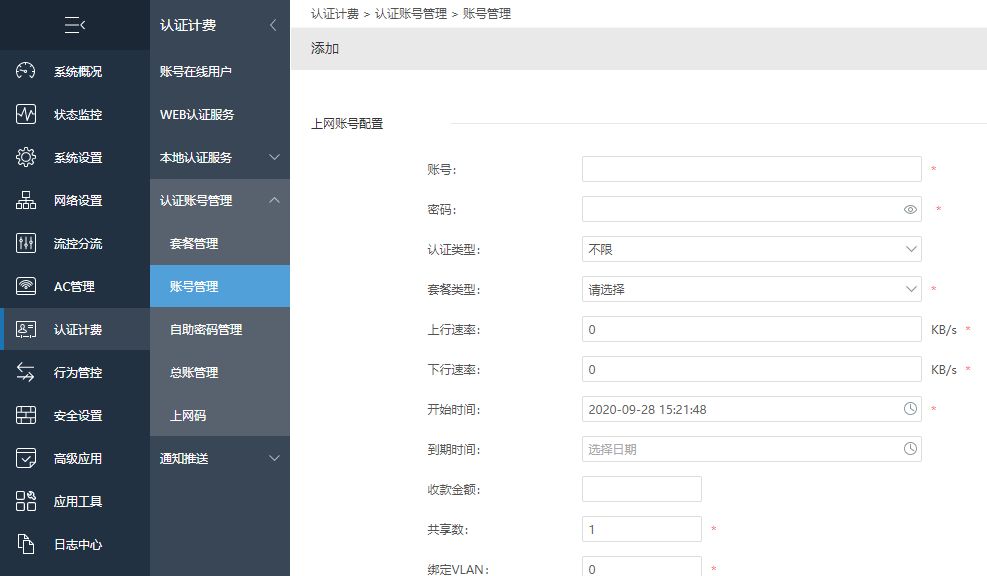 第四步:在认证计费--认证账号管理--账号管理里添加拨号的账号密码。