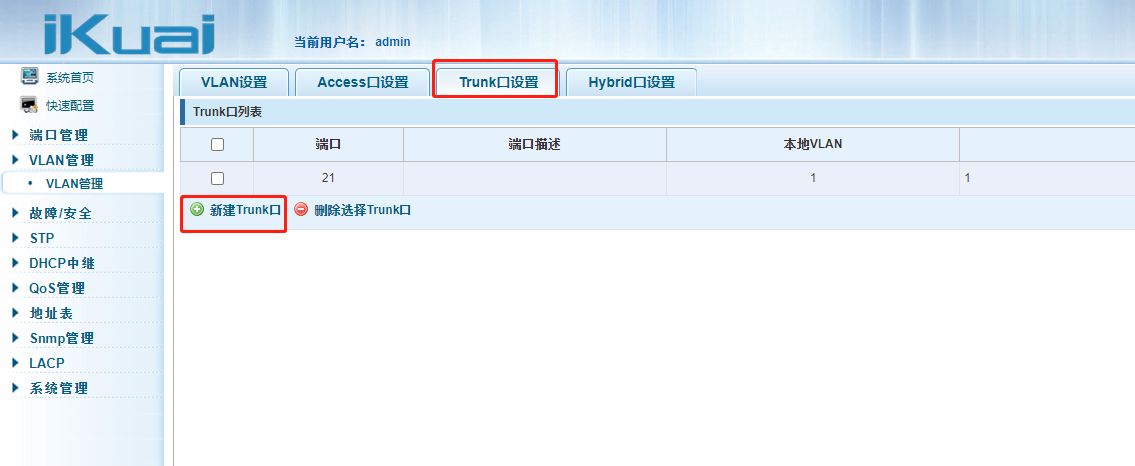 创建好VLAN之后,设置trunk口,点击新建trunk口
