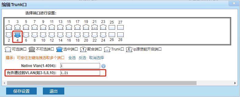 端口选择交换机接路由的那个接口,允许通过VLAN填写划分的VLAN,除了划分的VLAN以外还要填写VLAN1,填写好之后保存。