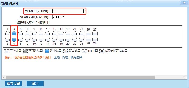 点击新建VLAN,进入VLAN配置页面,VLAN id填写路由上设置的VLANid,端口选择路由接交换机的接口和交换机接客户机的接口。