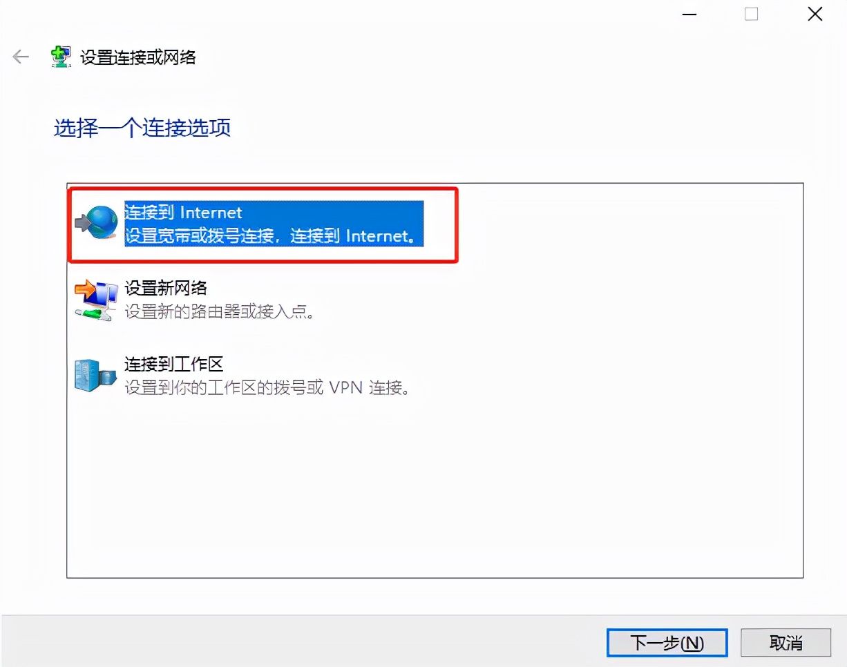 选择一个连接选项选择连接到Internet。