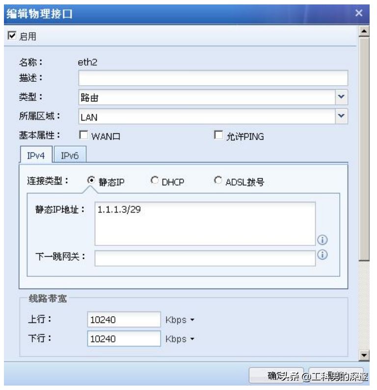 首先配置内网接口,通过『网络配置』→『接口/区域』→『物理接口』,点击需要设置成内网接口的接口,如 eth2。内网接口必须设置成路由接口,WAN 口属性为否,IP地址和网关可任意配置,如下图所示: