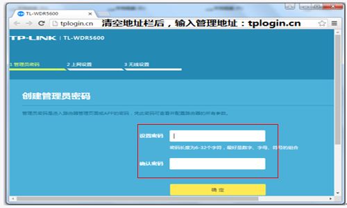 3、通过上一步确认好路由器的管理地址后,打开浏览器输入标贴上查看到的管理地址进入。如果您的路由器是刚购买处于出厂状态,则需要设置一个路由器管理密码,请按照提示设置。如果只要求输入密码,则输入路由器的管理密码,点击“确定”。