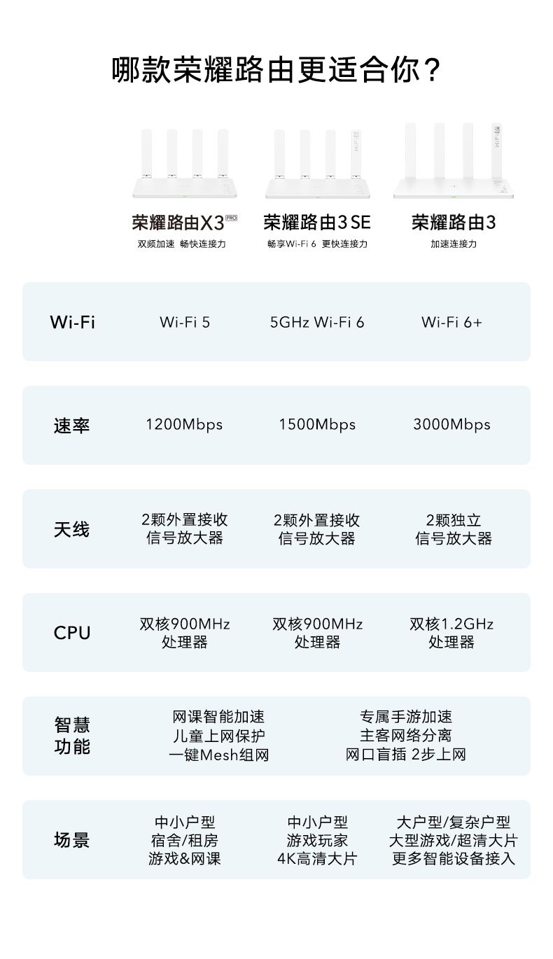 为什么选择荣耀路由器3 SE呢?首先是速率比我之前用的荣耀路由器X3 Pro快很多,高达1500Mbps,支持最新的WiFi6。如果预算高一些,也可以选择荣耀路由器3,其还支持华为荣耀手机独有的WiFi6+,网速比WiFi6还快,速率高达3000Mbps,穿透性能也强很多,适合大户人家。