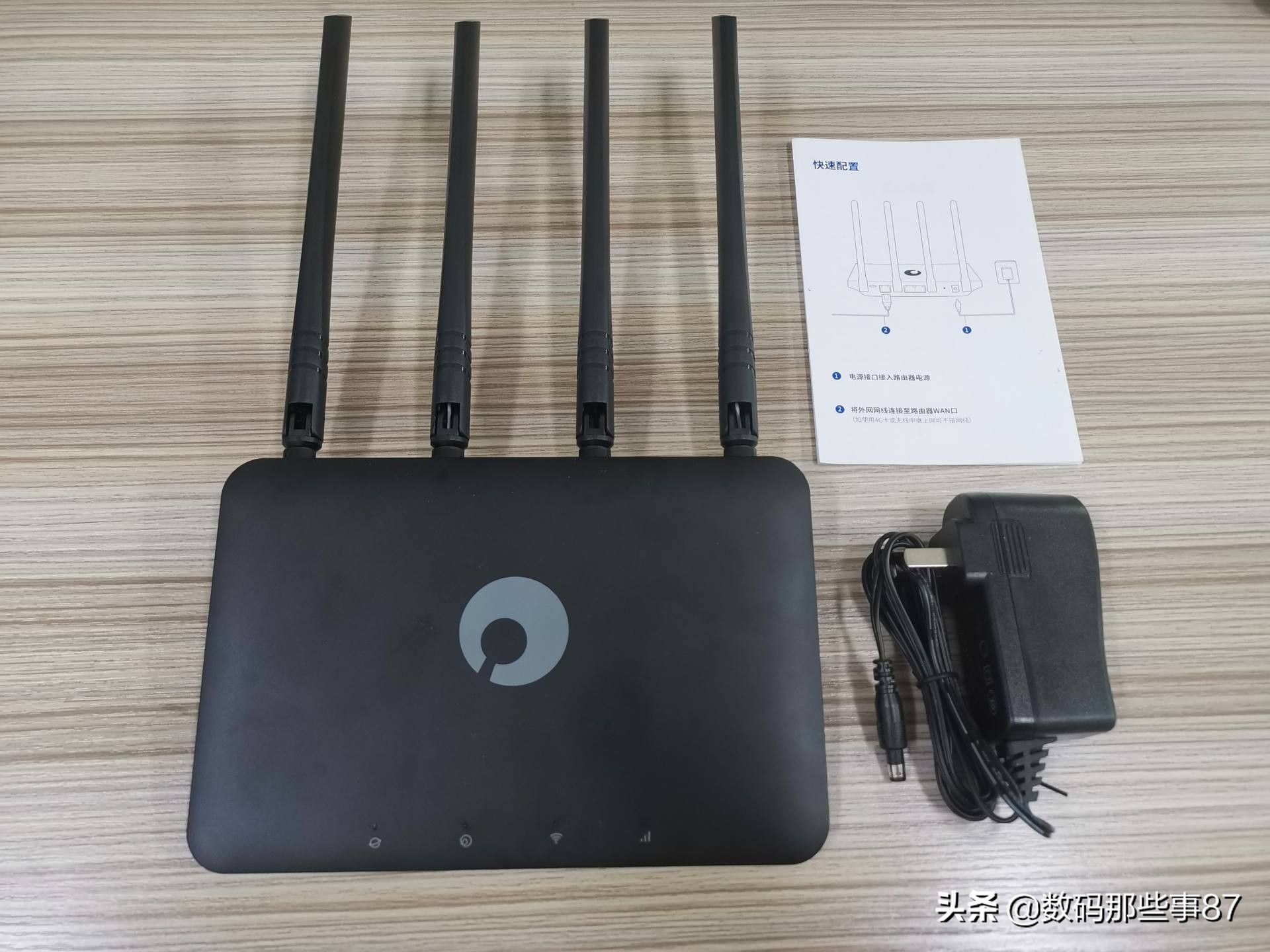 打开包装盒,里面是路由器、电源和说明书,另外还赠送了两张物联卡(一张联通,一张电信)。