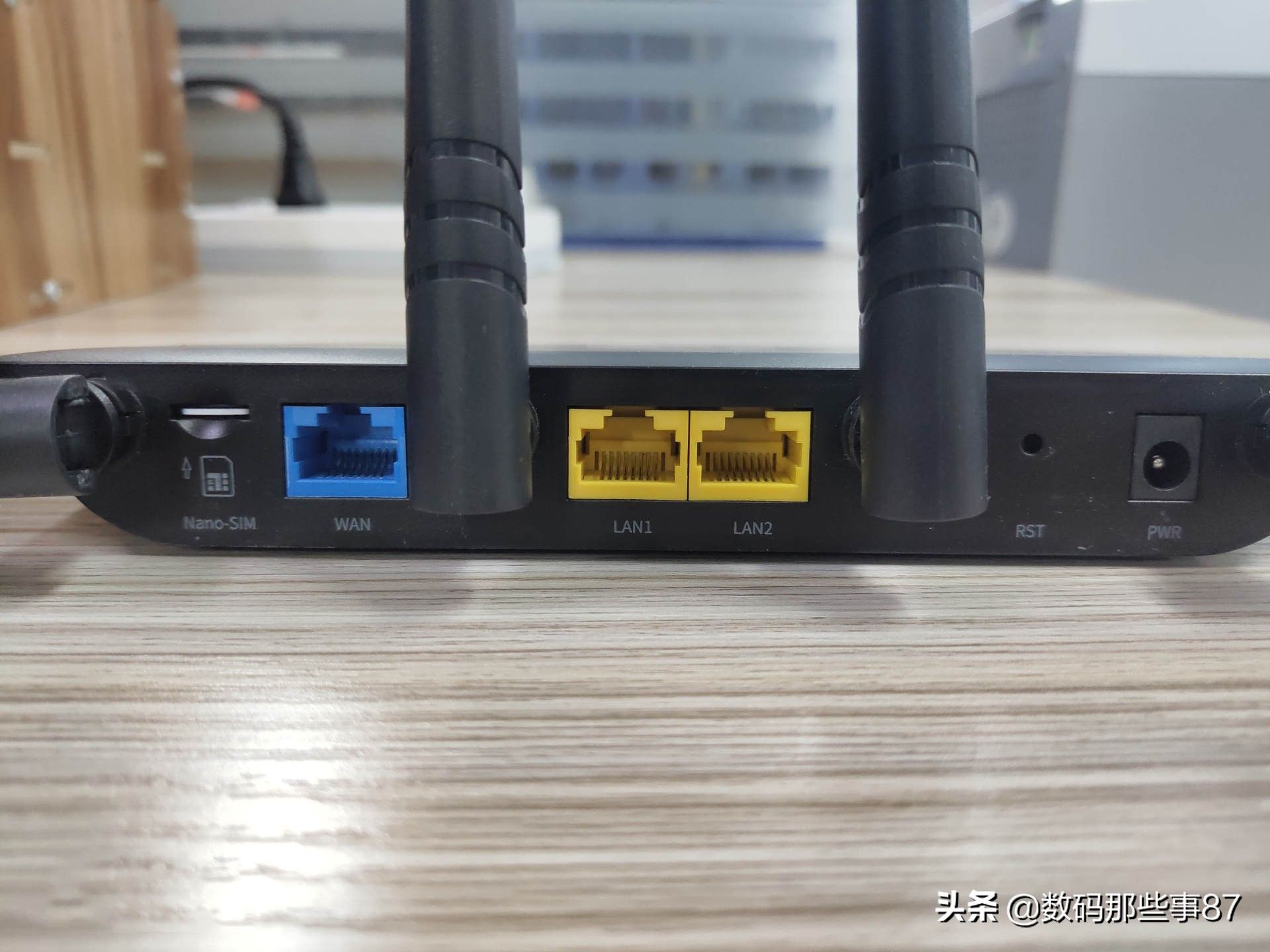 路由器的背面除了均匀排布着四根天线(2根2.4G WiFi天线+2根4G天线),还有1个百兆WAN口、2个百兆LAN口、1个SIM卡接口、1个重置按钮和1个标准电源接口。