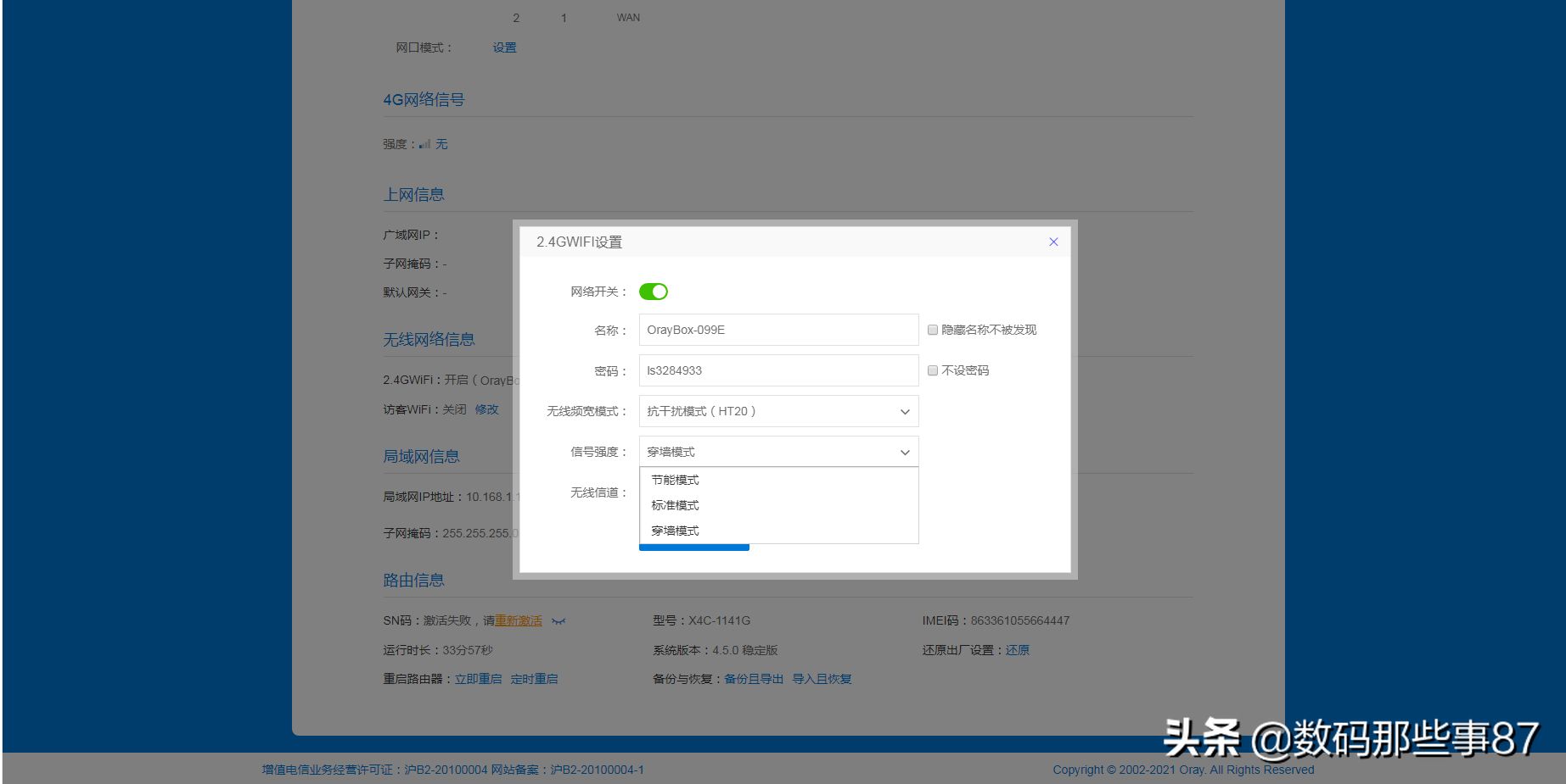 另外,在路由器的管理界面中,还能设置无线频宽模式、信号强度以及4G和有线同时使用时的优先级等方面。