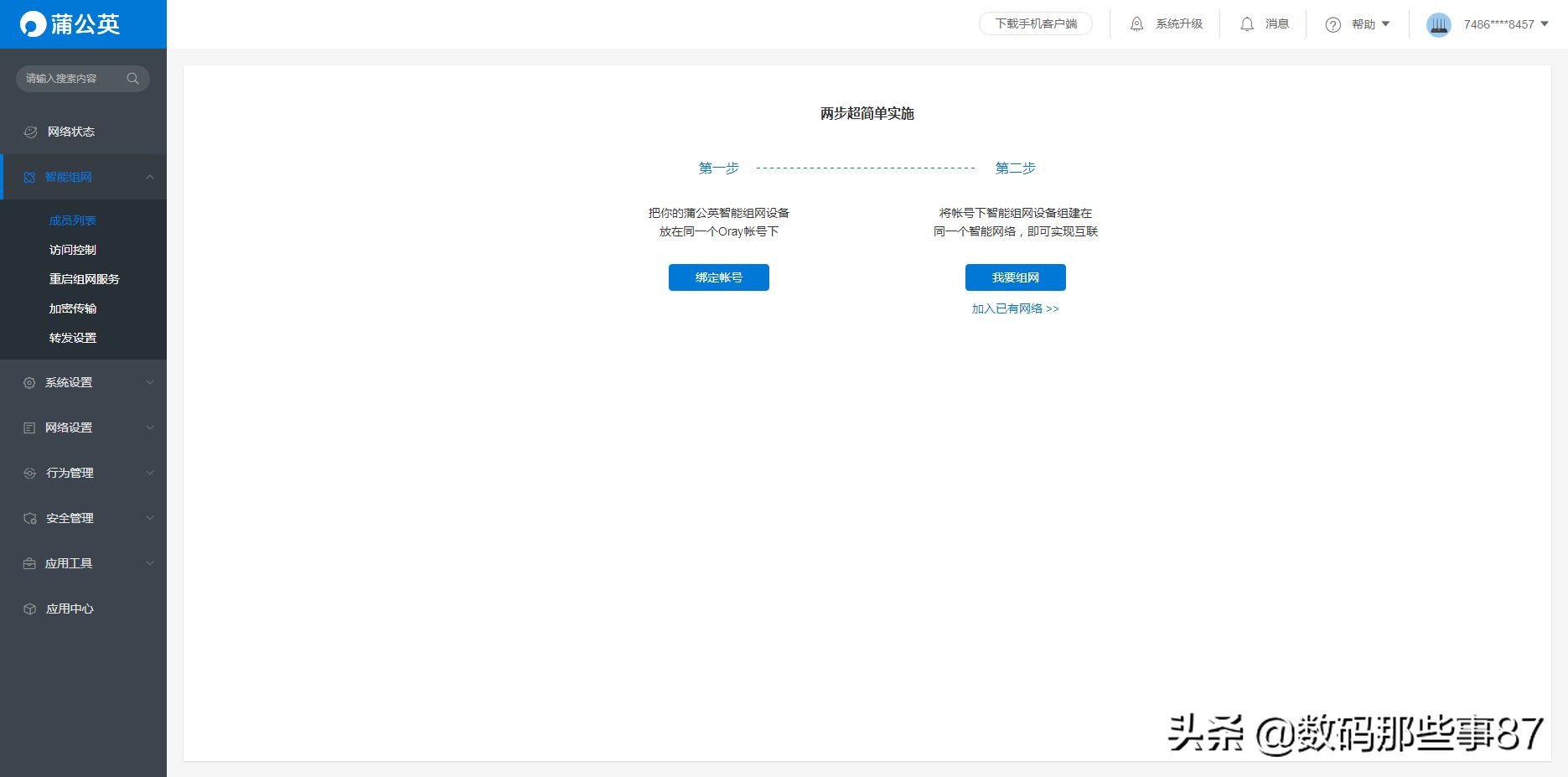 蒲公英X4C路由器除了支持4G卡上网外,还支持智能组网,这也是其它品牌的路由器不具有的功能。虽然我现在用不到智能组网,但我还是体验了一下智能组网的过程,它的搭建的步骤很简单,在蒲公英本地网络管理界面有一个智能组网功能,点一下会弹出操作引导,第一步注册并绑定Oray账号。第二步点我要组网。