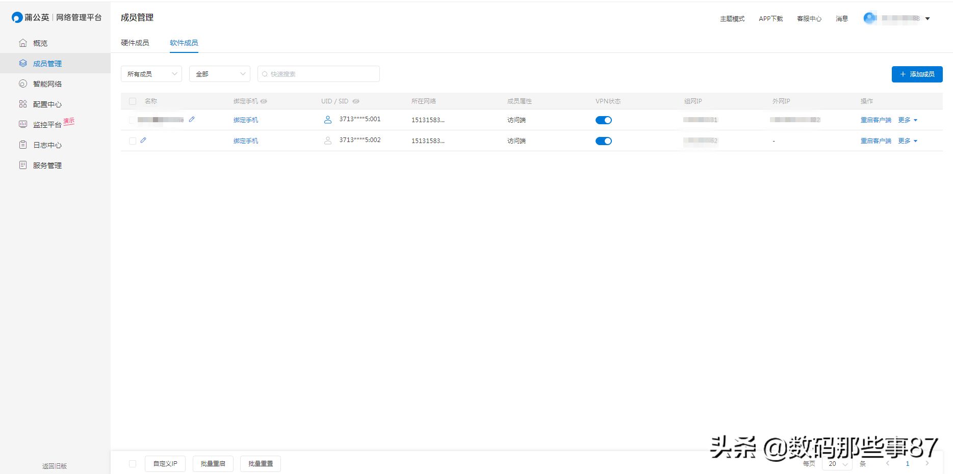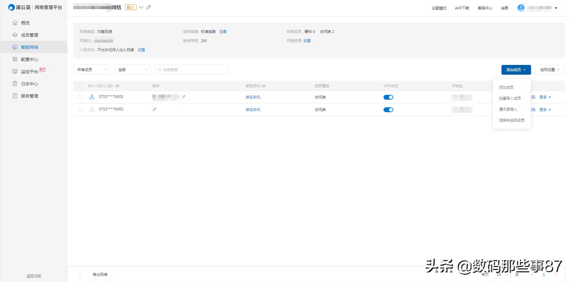 此时会跳转到蒲公英网络管理平台,在智能网络里就可以添加绑定硬件成员和访问端成员了。
