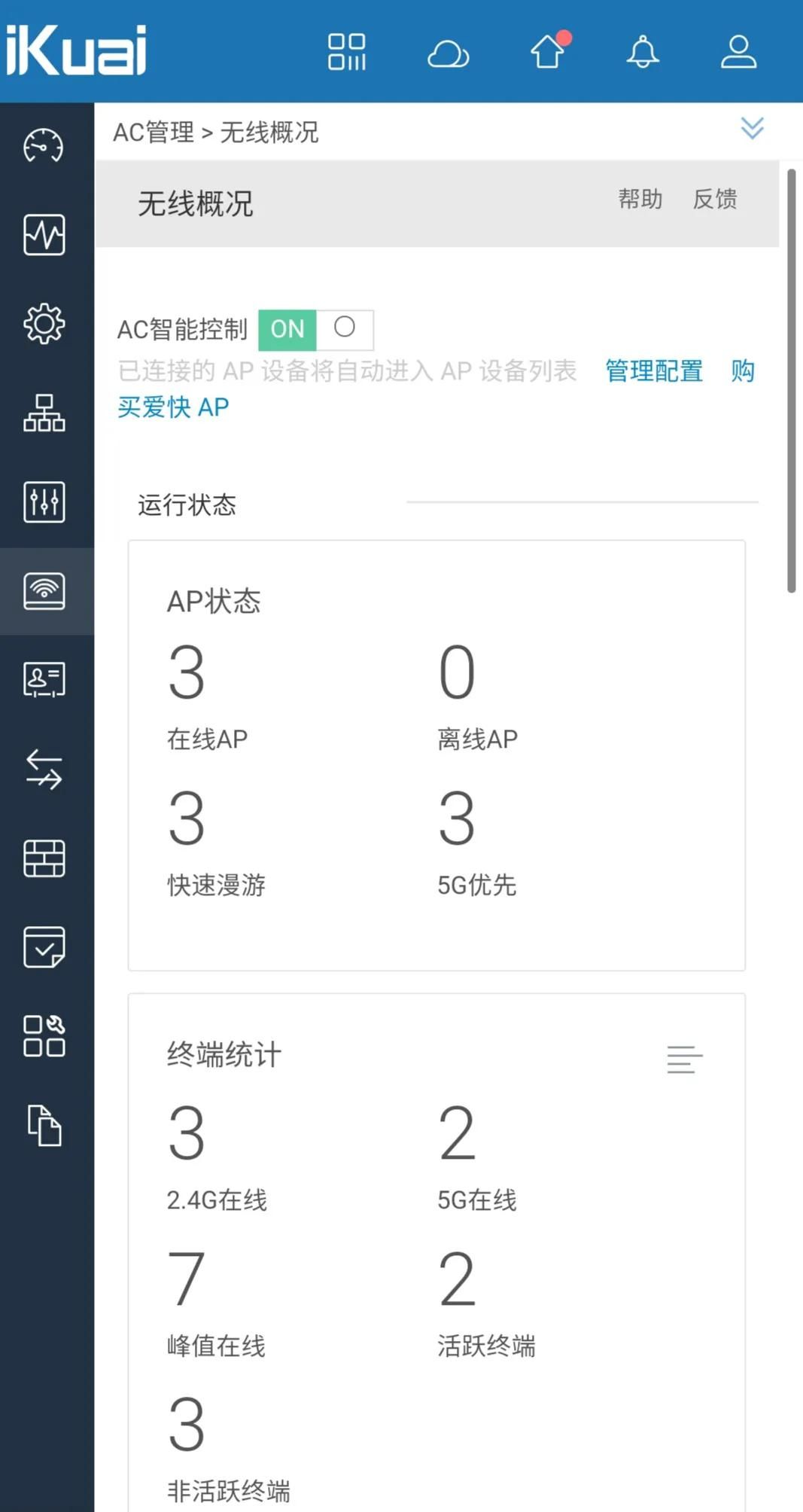 所有准备就绪,AP都插POE交换上,UPLINK口连在迷你主机的LAN口(迷你主机提前让商家刷最新的爱快了,省事)。WAN口插在光猫的LAN1千兆口上,提前让电信的宽带师傅也来了,光猫改桥接,关无线。这样,就完成了99.99%,然后找个电脑登录爱快,AC管理,智能控制打开,把你的无线名称密码改一下。再打开网络设置,内外网设置,WAN1,把接入方式改为PPPOE拨号,填入账号密码,保存。就大功告成了。