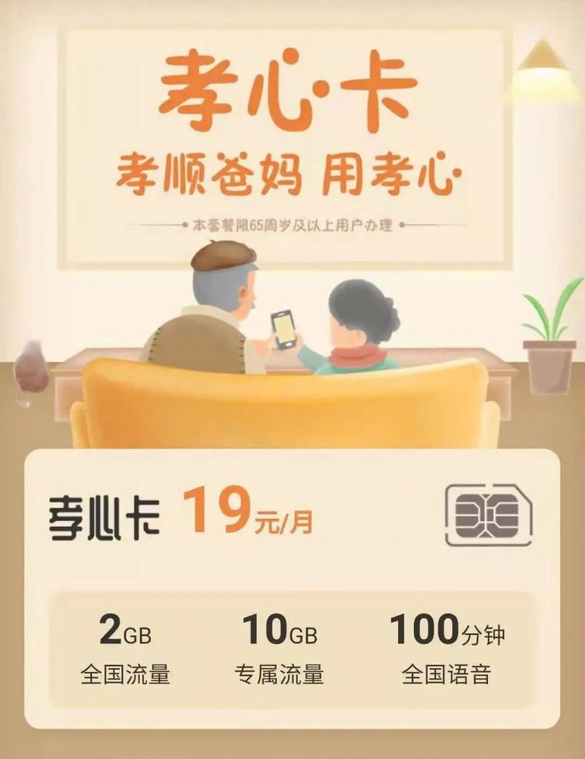 9月7日消息,近日,中国电信(China Telecom)推出了“孝心卡”,这是专门为65周岁以上用户推出的套餐,月套餐费为19元。