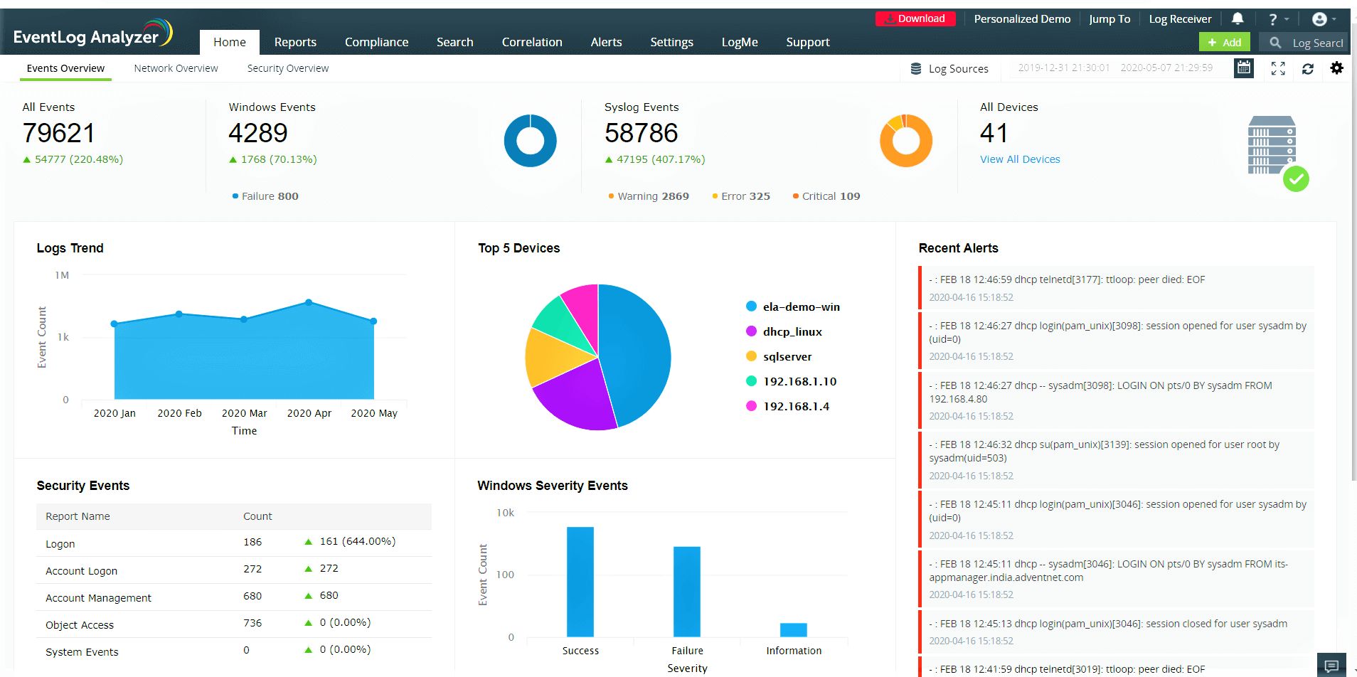 卓迈EventLog Analyzer是用来分析和审计系统及事件日志的管理软件,能够对全网范围内的主机、服务器、网络 设备、数据库以及各种应用服务系统等产生的日志,进行全面收集和细致分析,通过统一的控制台进行实时可视化的呈现。通过定义日志筛选规则和策略,帮助IT管理员从海量日志数据中精确查找关键有用的事件数据,准确定位网络故障并提前识别安全威胁,从而降低系统宕机时间、提升网络性能、保障企业网络安全。