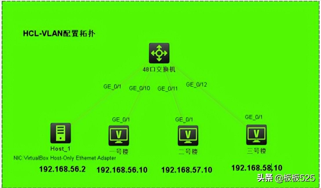 问题解决:H3C网络设备模拟器HCL安装使用,参考我的另一篇文章<使用电脑也可以学习交换机配置-H3C模拟器安装>,文中描述软件获取,加为粉丝私信(发送:hcl),使用如下拓扑图。
