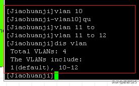 [Jiaohuanji]dis vlan #显示现有vlan,有1号属于默认vlan,10-12号上面创建vlan