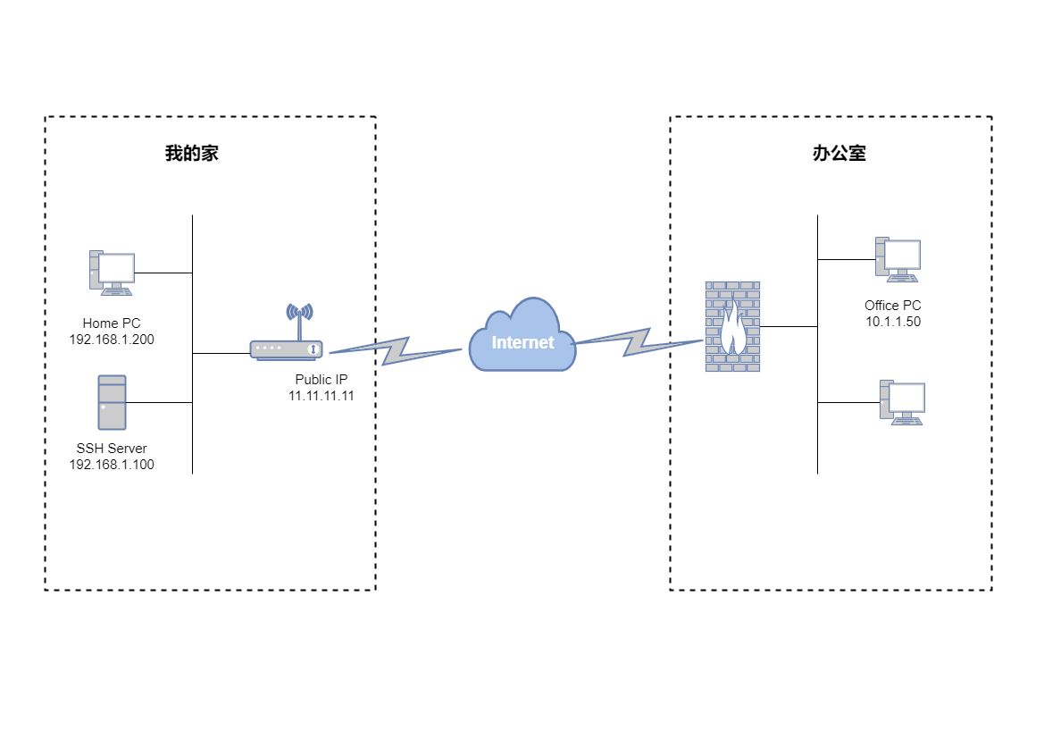 平时,我偶尔需要通过远程桌面连回家里面的电脑,下载一些文件或者做一些测试。但是,如果直接把电脑的远程桌面服务(TCP/3389)发布到公网上,数据肯定是得不到保障的。这时候,我想到了家里还有一台7 x 24小时运行的树莓派。这个小身板又能派上大用场了。我打算利用树莓派的SSH服务,将办公室电脑和家里电脑的连接打通。