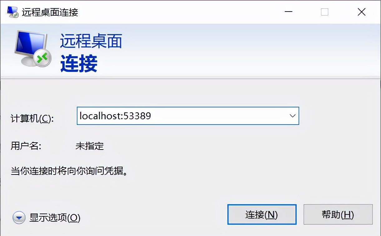 最后,打开办公室电脑上的远程桌面连接(mstsc.exe),然后输入: localhost:53389,就可以连回家里的电脑啦。
