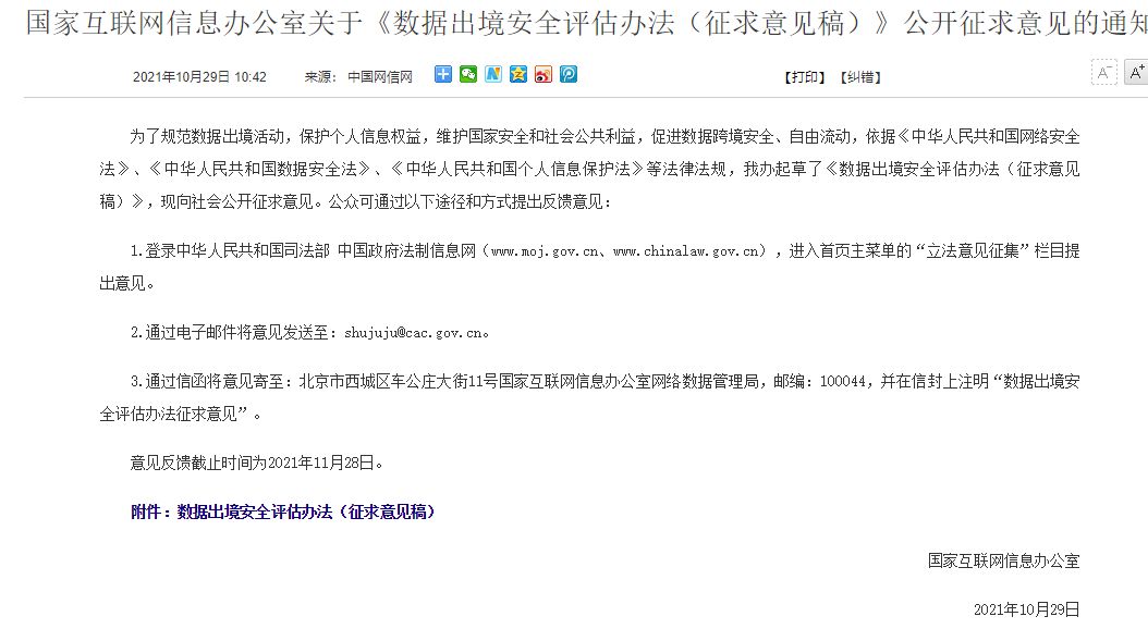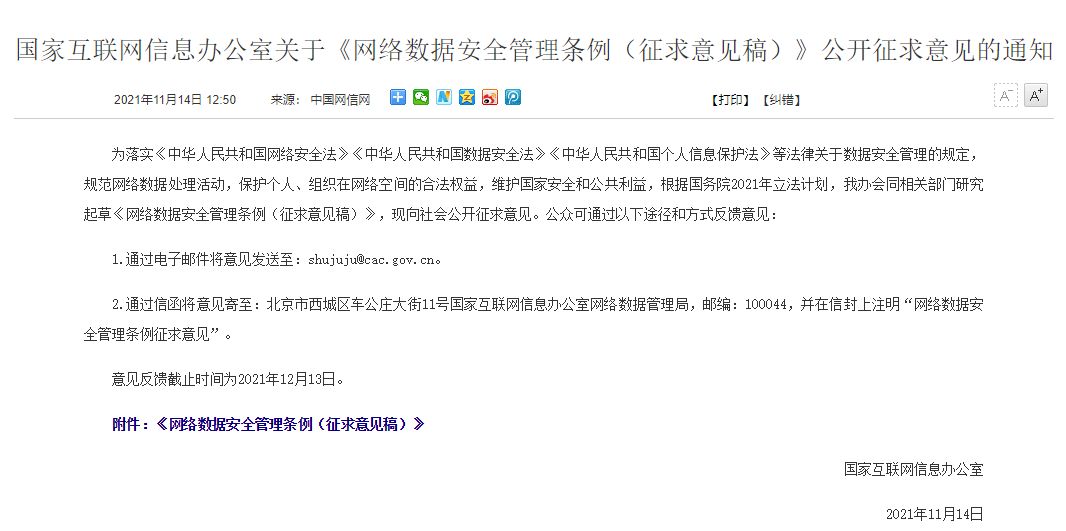 11月14日,国家互联网信息办公室发布了关于《网络数据安全管理条例(征求意见稿)》公开征求意见的通知。