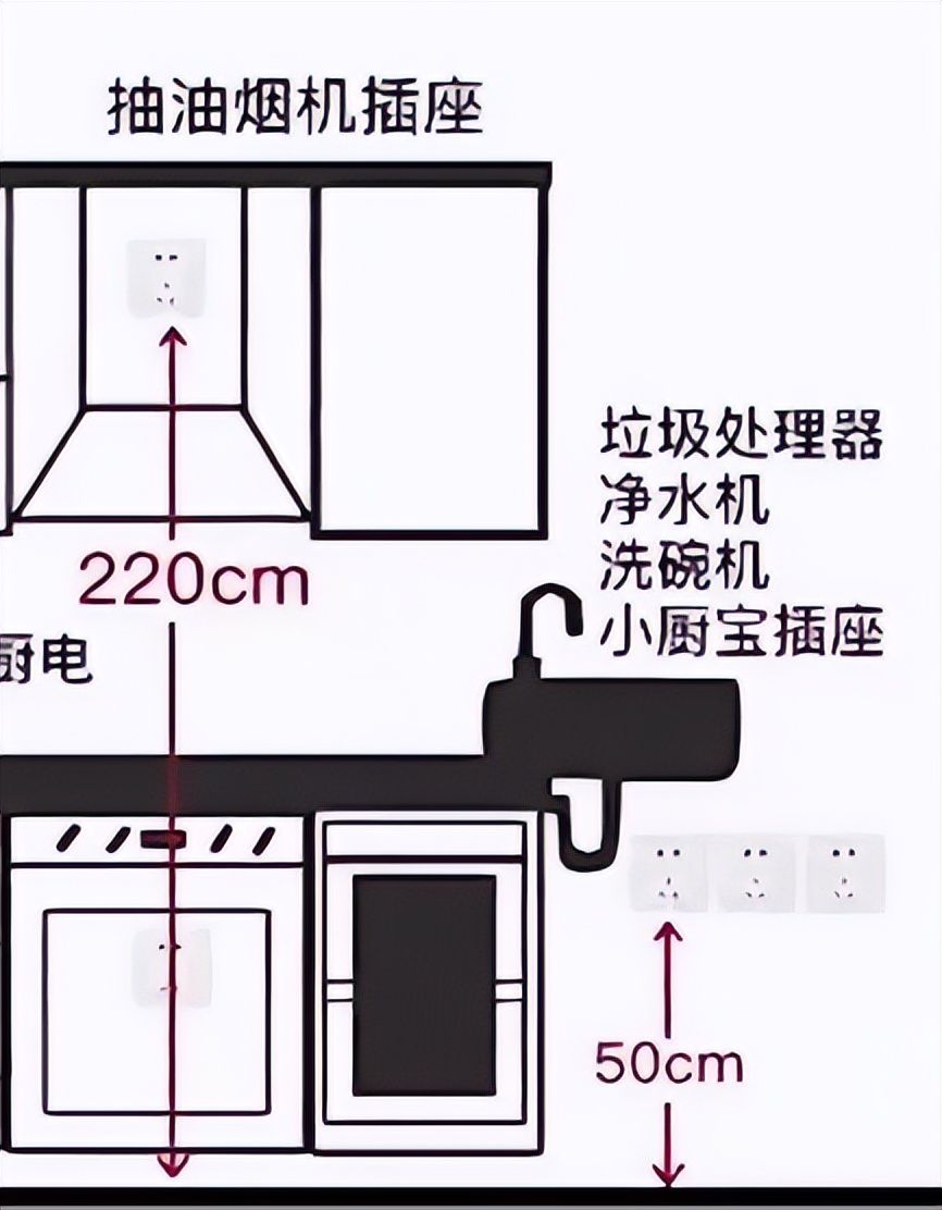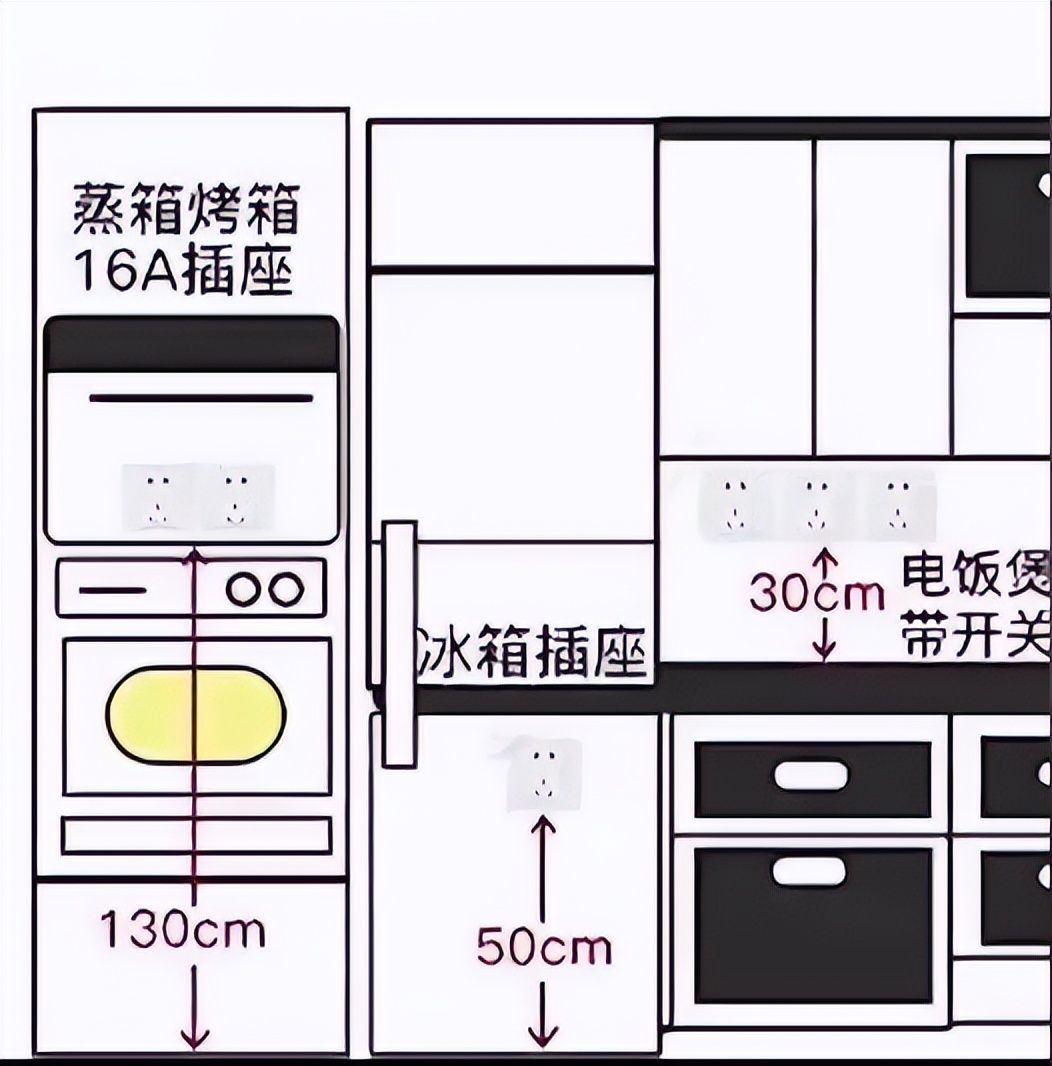 8,蒸箱烤箱插座1米3,冰箱插座50公分,电饭煲和小家电高出台面30公分,