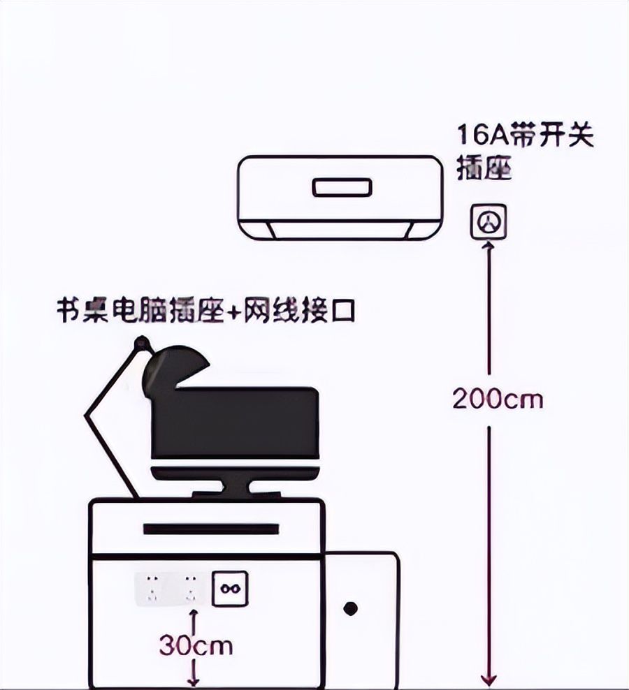 12,电脑网线插座30公分,如果在化妆台高度1米的位置另外预留一个插座,卧室挂机空调2米,床头插座80公分。
