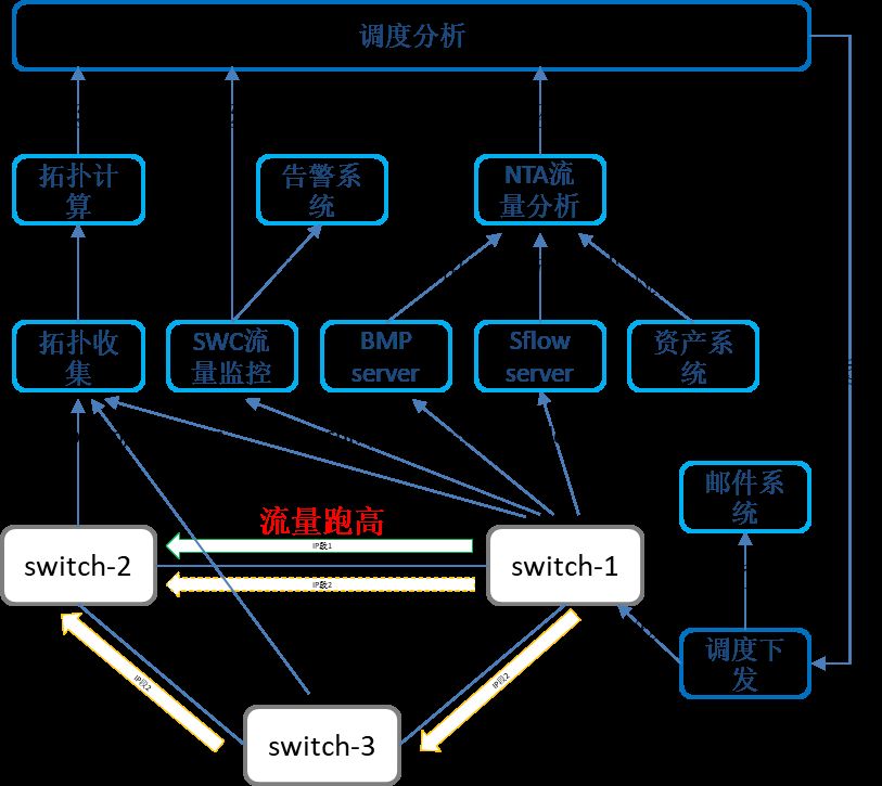 - SWC注释①流量监控发现switch-1到switch-2方向流量超过设置的阈值,会通知告警系统,如图中①,同时会将链路信息及当前流量信息发送给调度分析系统,如图中②;