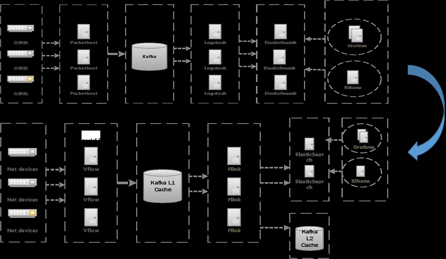 为了解决这个问题,我们调整了架构:前端负载到多台flow-agent,将数据流打标从Logstash调整到Vflow,在解包的同时就打好相关标签,分析后入一级Kafka,对接Flink流数据处理,对数据进行加工统计,汇入到ES集群和二级Kafka,最终实现延时在分钟内的业务数据查询。