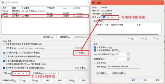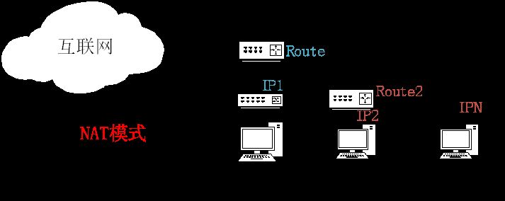 NAT模式相当于在“仅主机模式”中,将交换机模式的VMnet1变成了家用NAT路由器连接到主机网卡,将原本的二层专用网络变为带有路由的三层专用网络。(这种连接方式就是家庭中两个路由的桥接方式。)