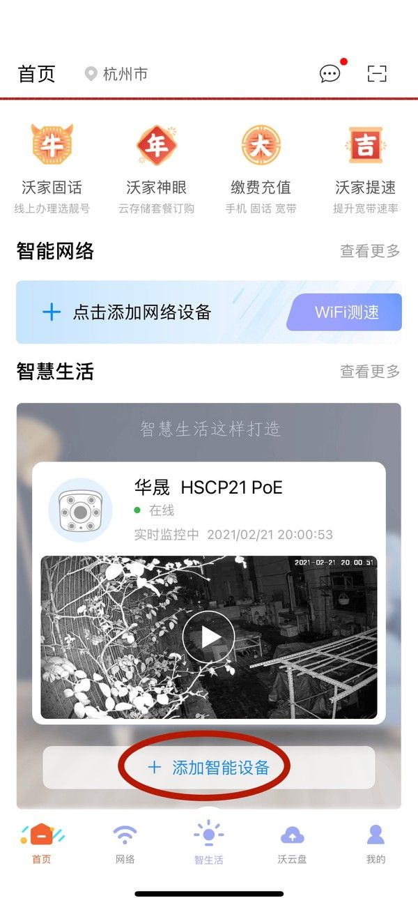 接下来我们需要安装手机APP——智能沃家。添加智能设备,用APP自带的扫描程序扫描摄像头上的条形码即可。添加完成,等待摄像头连接网络之后,我们就能在手机上看到这样的监控画面。