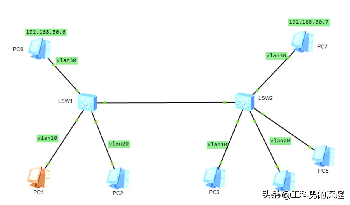 2、PC2、PC4、、PC5属于VLAN20,能互通;