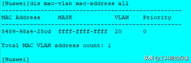 [Huawei-vlan20]mac-vlan mac-address 5489-98A4-25CD//通过此命令配置MAC地址与VLAN关联,有几台终端,关联几台终端MAC;
