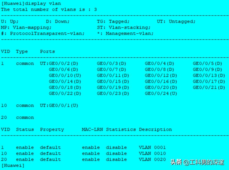 [Huawei-GigabitEthernet0/0/1]port hybrid tagged vlan 20