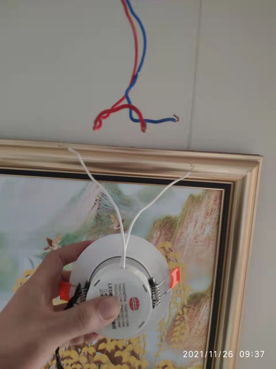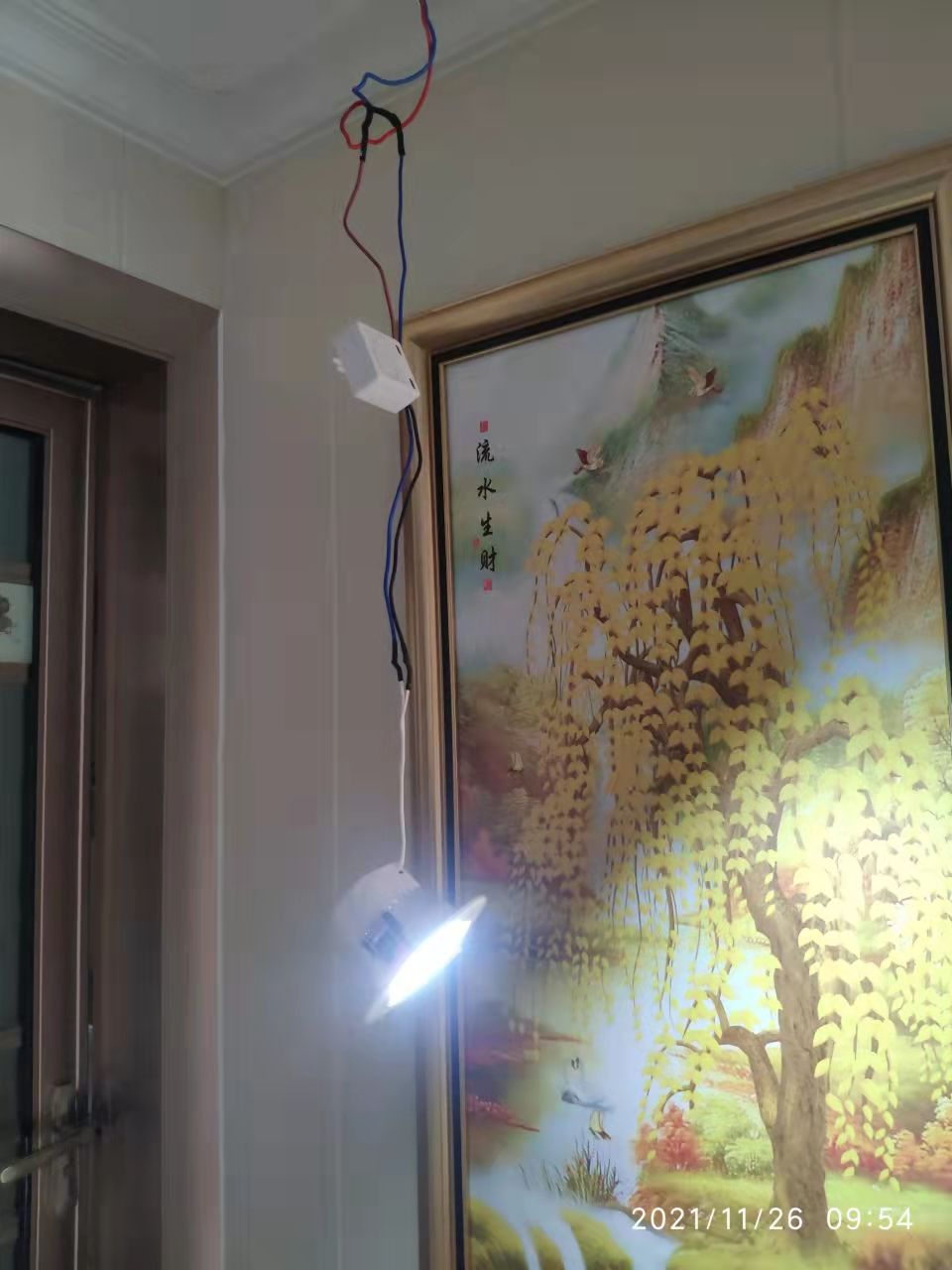 第五步,WIFI通断器输出端接灯具,无需分零火线,并缠好黑胶布。